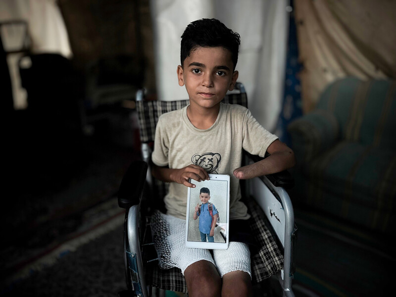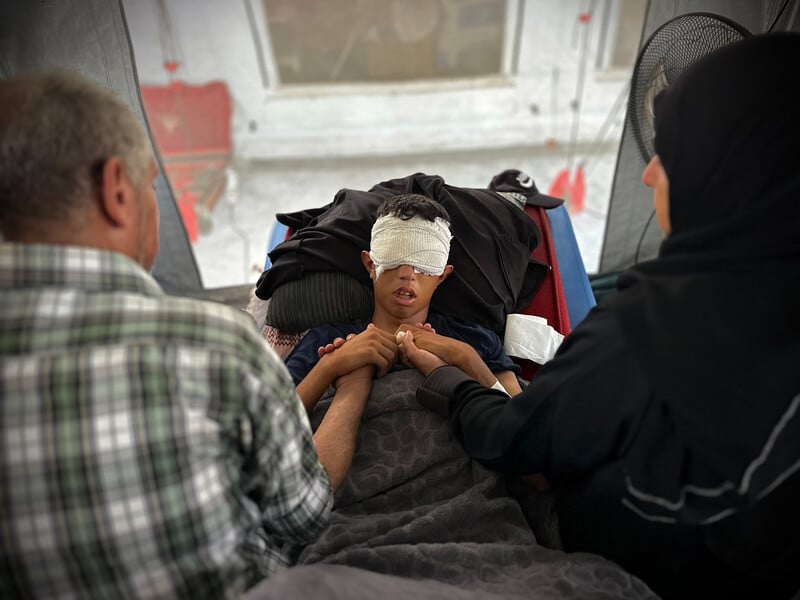 Taha Abu Labda, 18, lost his eyesight after being shot directly in the eyes by an Israeli sniper while trying to rescue a wounded man lying on the ground. Photographed on 6 September, the teen was rushed to Nasser Medical Complex in Khan Younis, southern Gaza, but doctors were unable to save his vision. Taha later died from his injuries.