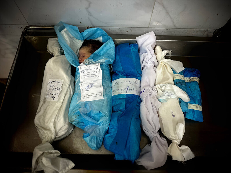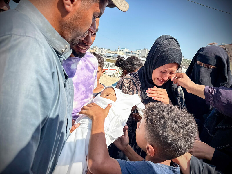 Mourners bid farewell to 11-month-old Isil Salem al-Arja, who died at Nasser Medical Complex in Khan Younis, southern Gaza, 26 September. The baby was severely malnourished due to a lack of milk and nutritious food in their displacement camp. She had been hospitalized two weeks earlier but was forced to return to dire living conditions, leading to her death.