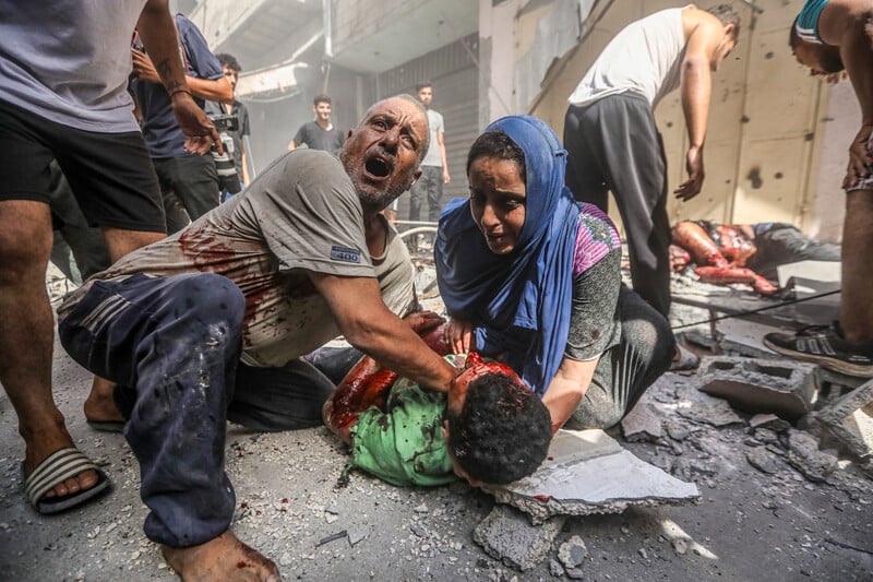 People react after a deadly Israeli attack on a group of civilians preparing to move south in Beach refugee camp, west of Gaza City, 23 September.