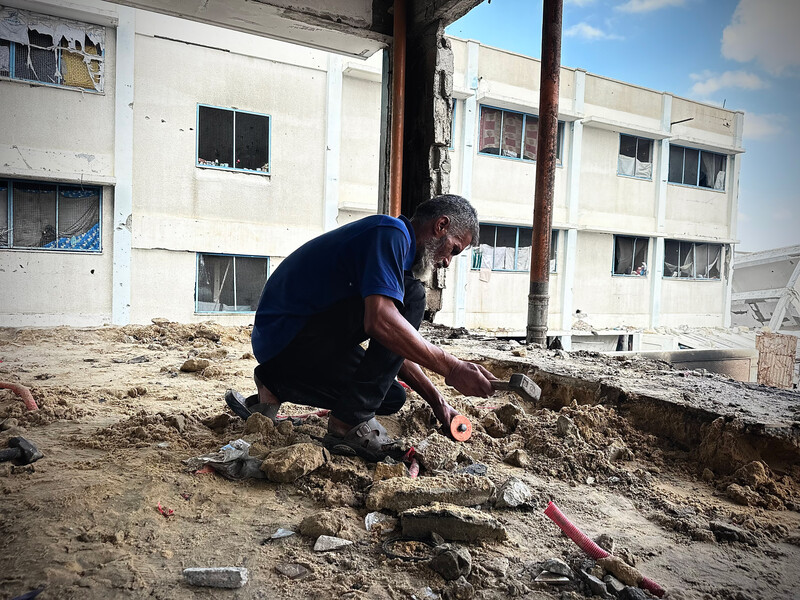 A man cleans a room that was previously used as a bathroom in order to create a living space for his family in a damaged school in al-Masawi, in the southern Gaza Strip, on 24 September.