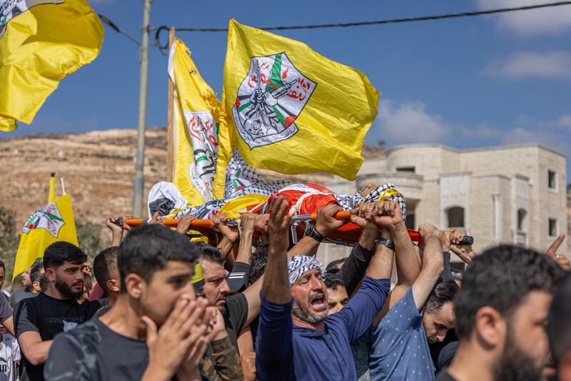 The funeral for 20-year-old Said al-Nassan in al-Mughayyir, east of Ramallah in the West Bank, following his death from settler fire during a raid on the village the previous day, 24 September. Israeli settlers opened fire toward mourners and photographers who were present, but did not hit anyone.