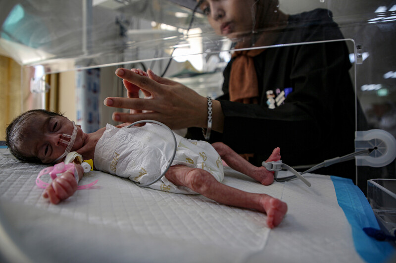 A baby born prematurely receives care in an incubator at Al-Aqsa Martyrs Hospital in Deir al-Balah, central Gaza Strip, where the neonatal unit is overcrowded after infants were transferred from hospitals in Gaza City following the Israeli ground incursion, 29 September.