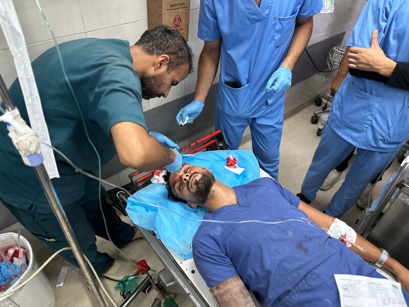 A nurse is treated at the emergency department after being shot in the head by Israeli forces while on duty at Nasser Medical Complex in Khan Younis, southern Gaza Strip, 29 September.
