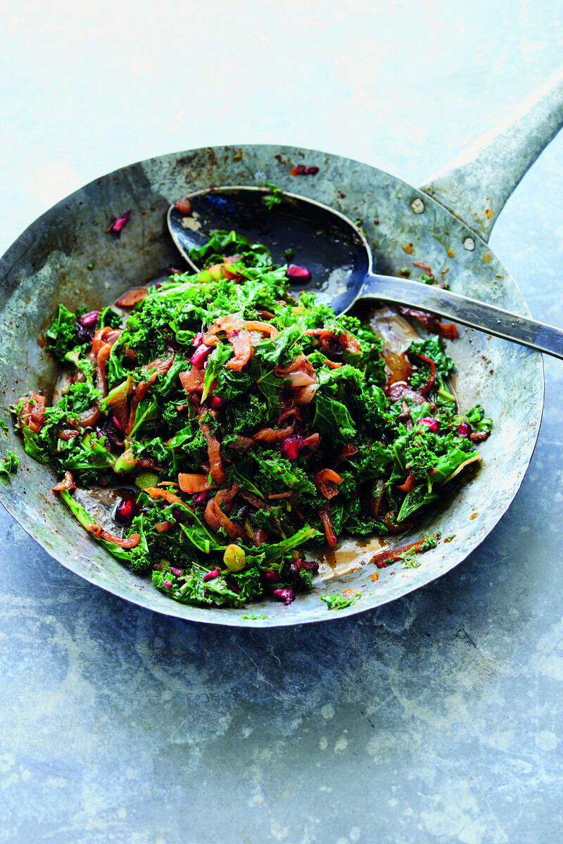 Hindbeh — dandelion leaves with caramelized onions, pomegranate and sumac — another dish from Palestine On A Plate.