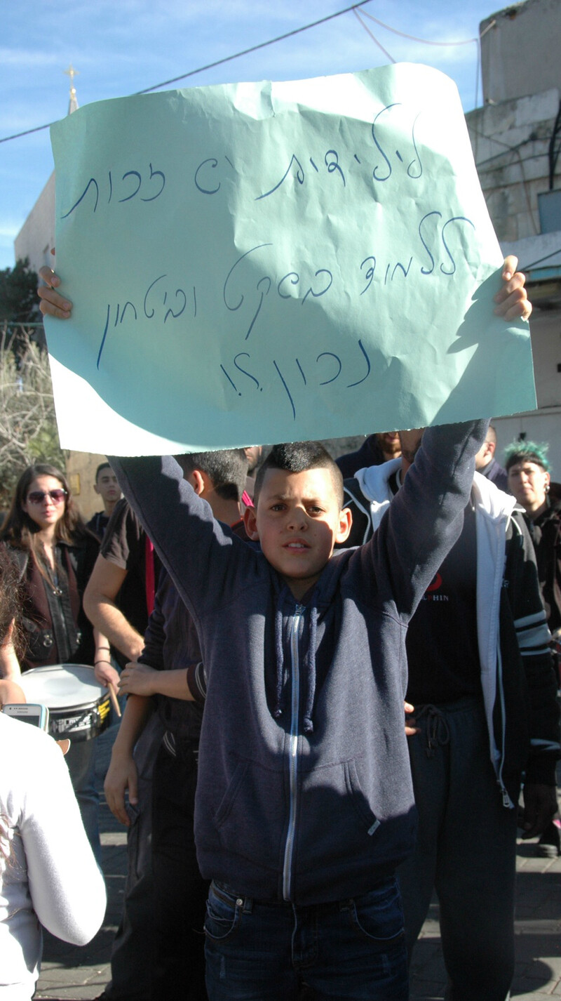 At a 23 January protest in al-Tur, a boy holds a sign that reads: “Children have a right to study with peace and safety, right?!”