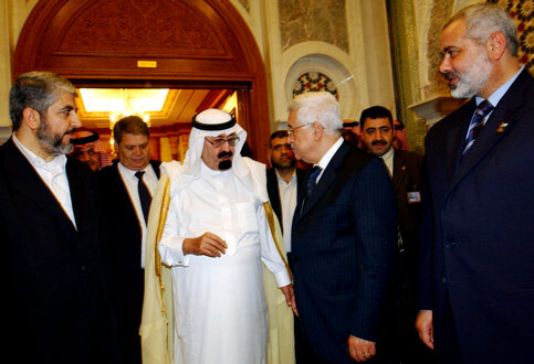 Hamas and Fatah delegations headed by Palestinian President Mahmoud Abbas and Hamas leader Khaled Mashaal meet with Saudi Arabia’s King Abdullah in Mecca, Saudi Arabia, 7 February 2007. (MaanImages/POOL/PPO)