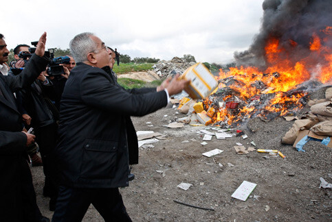 Salam Fayyad throws products made in Israeli settlements into a fire in the occupied West Bank. (Mustafa Abu Dayeh/MaanImages)
