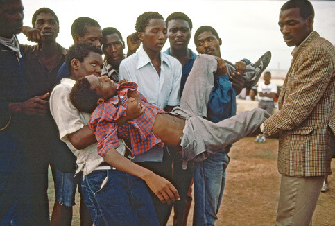 A South African is carried away after being injured by police at an anti-apartheid demonstration in Cape Province, 1985. (UN Photo)
