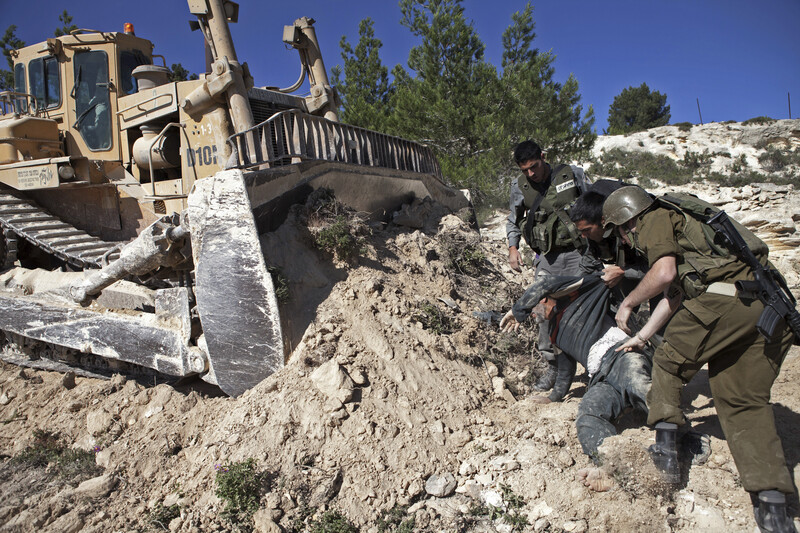Israeli occupation forces arrest a Palestinian next to a bulldozer during a protest blocking the bulldozers that are clearing the path for the wall, April 2010.