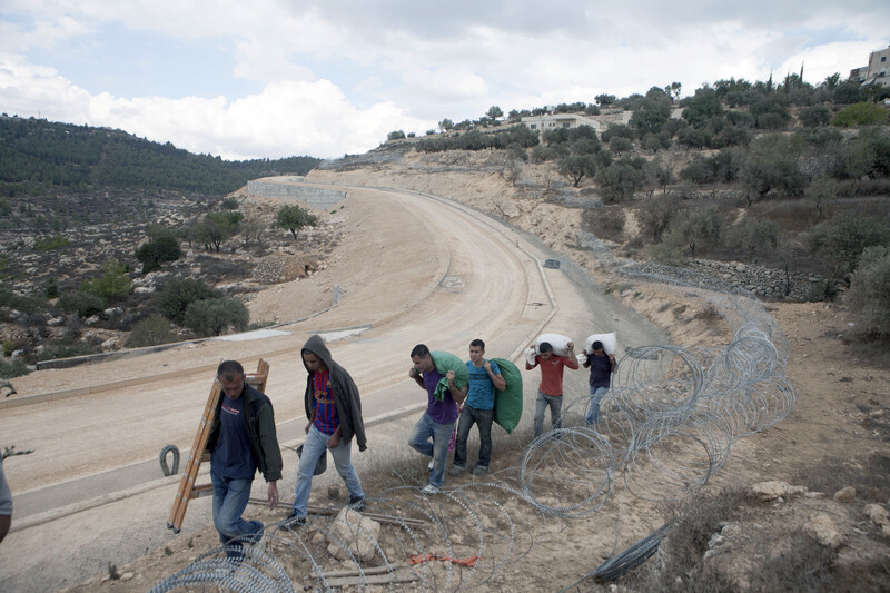 Members of the Atrash family carry equipment and olives through the mountains by the route of the wall after harvesting on their lands on the other side of the barrier, October 2012. The family owns more than four dunums in the al-Walaja valley. The family can only get to their lands by walking through the mountains and going through a gap in the wall.