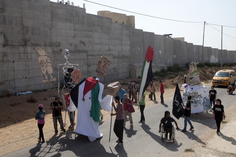 A protest march with giant puppets made in the village passes by the separation wall near the Har Gilo settlement, September 2012. Har Gilo, established during the 1970s, is built on the lands of al-Walaja and Beit Jala. All Israeli settlements in the occupied West Bank are illegal under international law.