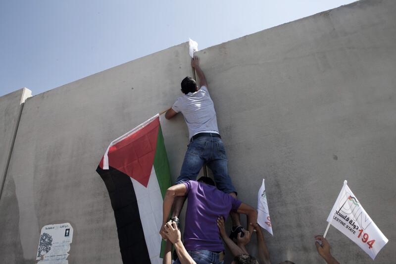 A Palestinian climbs the separation wall to raise the Palestinian flag in front of Har Gilo settlement during a demonstration, September 2011.