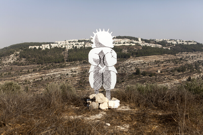 A cardboard representation of the character Handala, created by the Palestinian cartoonist Naji al-Ali, during an event protesting the building of the wall, September 2012. Handala is a symbol of Palestinian resistance and steadfastness.