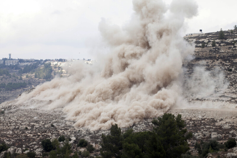 A huge cloud of dust hangs in the air following an explosion, in which the Israeli army blew up parts of the mountain to clear the route of the wall, November 2011. A series of explosions caused damage to nearby houses.