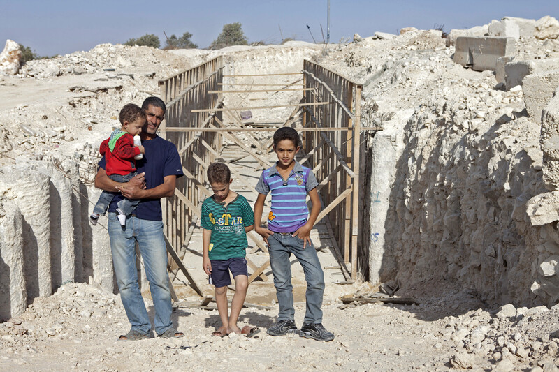 Omar Hajajlah and his three sons in front of the construction site of a tunnel built in front of his house, October 2011. The house of the family was left on the “other” side of the route of the separation wall. The tunnel will be the house’s only connection to the village and the home will be completely surrounded by an electrified, four-meter-high barrier. Hajajlah works in East Jerusalem. Since the start of the construction of the wall in front of his home, he was hospitalized twice due to heart problems. A military gate was also put in front their house, blocking the road leading to the Cremisan Monastery and the Salesian Sisters’ school, which Hajajlah’s children attend. Instead of a few minutes’ journey to school, they have to take a detour of several kilometers.