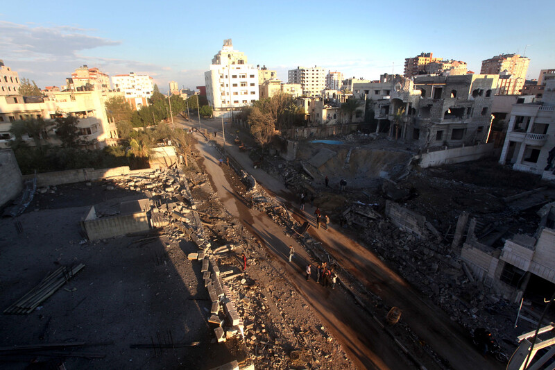 Palestinians inspect their damaged neighborhood after Israeli air strikes in Gaza City, 15 November.