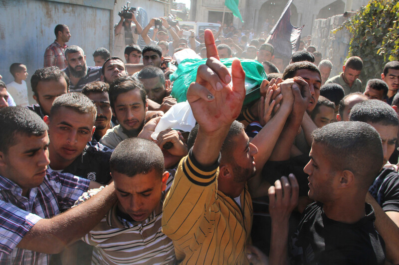 Thirteen-year-old Ahmad Abu Daqqa is mourned during his funeral in Abbassan al-Kabira, east of Khan Younis in the southern Gaza Strip, 9 November. The boy was shot in his stomach by an Israeli soldier while playing football outside his home.