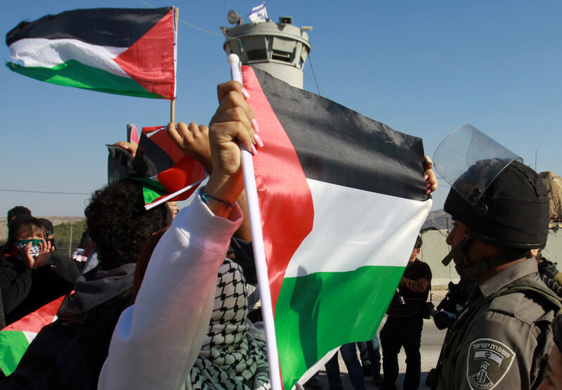 Palestinian women break into an Israeli military camp near the West Bank city of Ramallah in protest of Israel’s military attacks on Gaza, 15 November. Several of the women were arrested.