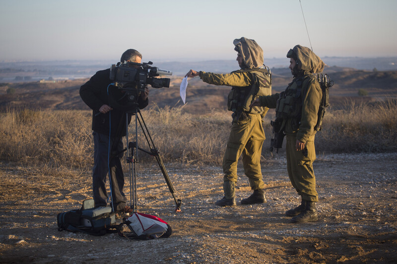 Israeli soldiers display a military order to a cameraman in southern Israel to prevent him from filming Gaza, 15 November.