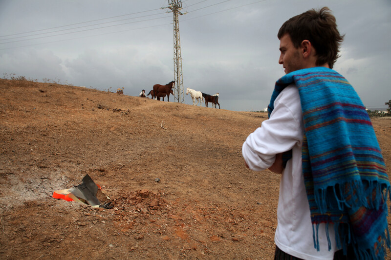 A man looks at an exploded Qassam rocket fired from Gaza Strip in an open area near Kibubutz Nir Am in southern Israel, 11 November.