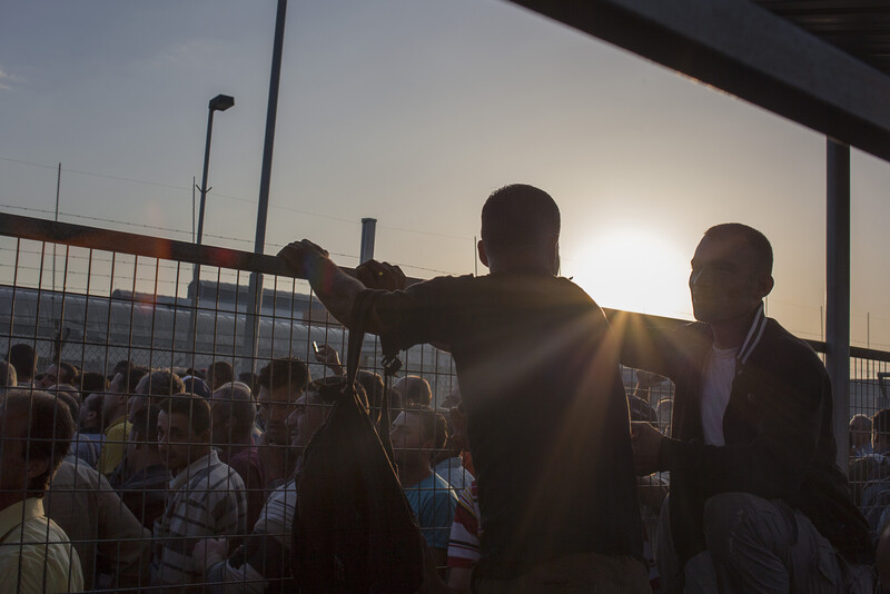 The sun rises on a crowd of Palestinian men still waiting to file through the single gate into the Eyal checkpoint. The checkpoint will remain congested until late into the morning.