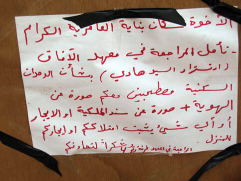 “To the residents of the Amiriyyah building Please visit the Afaq Center, Sayyid Hadi bridge. Please bring along any paper that proves your rent or ownership of a unit in the building. Thank you for your cooperation.”