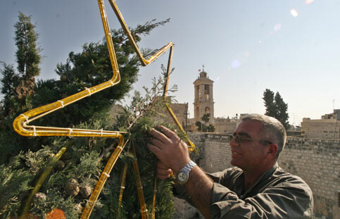 A Palestinian man decorates the Christmas tree in front of the Church of Nativity in Bethlehem December 14, 2005. (MAANnews/Magnus Johansson)