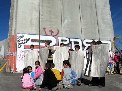 Palestinian children from the Open Window School in Bethlehem staging a theater play about opening the wall, under the watchful eyes of Israeli border police, near the main checkpoint in Bethlehem December 2, 2005. After more than five years of violent conflict, the barrier separating Bethlehem from Jerusalem has been completed (MAANnews/Khaleel Reash)