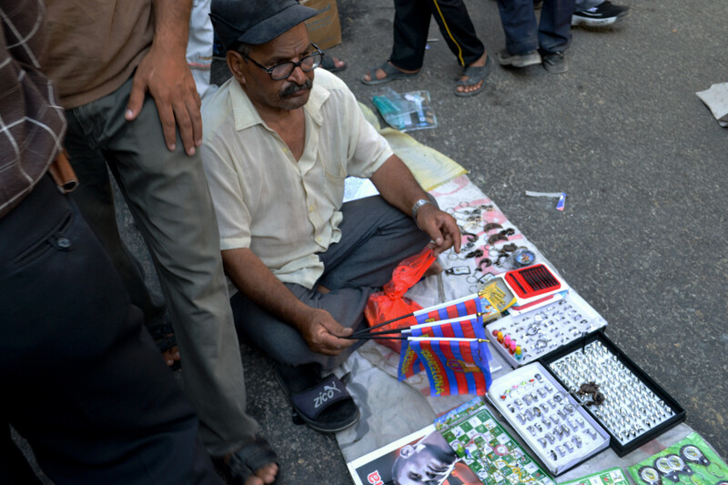 A street vendor sells FC Barcelona flags and trinkets at the Friday market in Gaza City. The football club has a large following in Gaza.