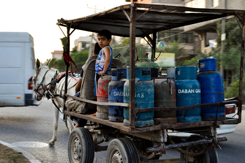 A donkey-pulled cart is used to collect and distrubute gas canisters in Gaza City.