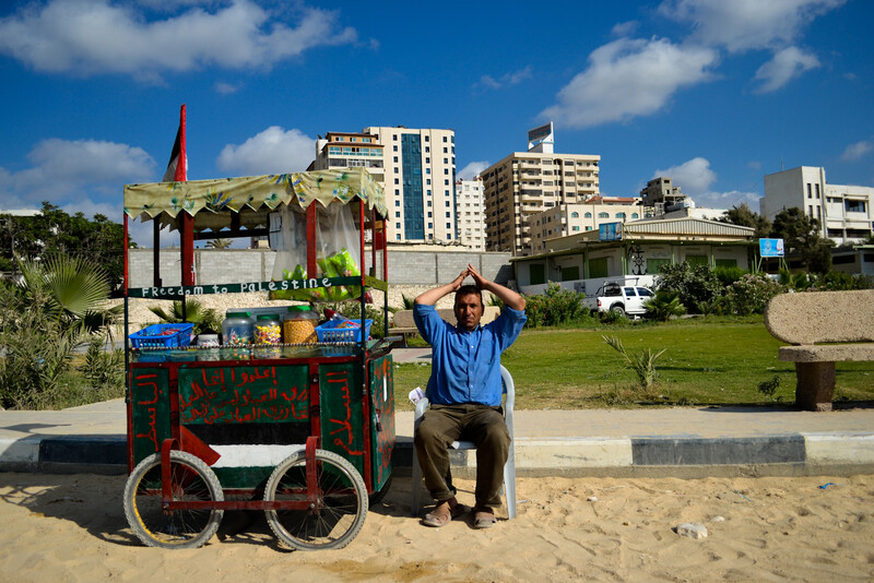 A street vendor sells candies along the Gaza coast from a cart reading “Freedom to Palestine.”