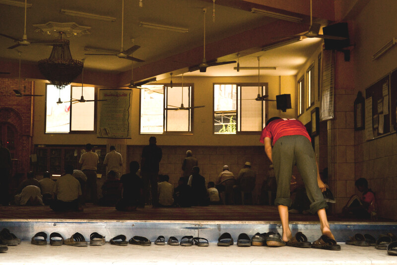 A man places his sandals at the entrance of a Gaza City mosque.
