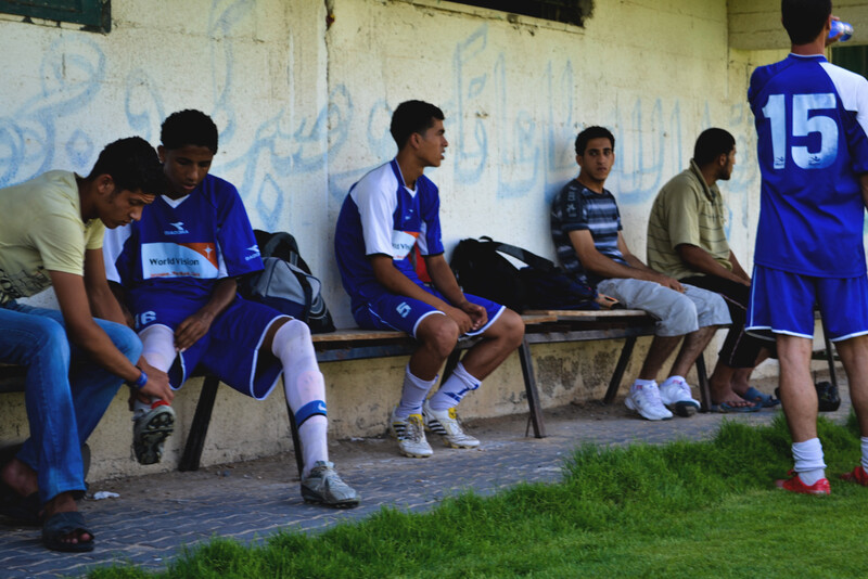 A soccer team prepares to play a rival team at one of Gaza City’s two grass fields.