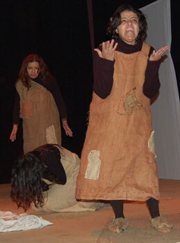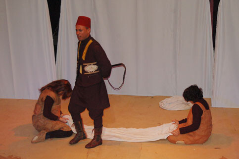 Directed by Hussein al-Asmar and supported by the European Union, the play starts with the three women rolled in tight white burial shrouds as they try to break out, while an invisible force represented by male actor Nidal Damu works against them to keep them in their place.
