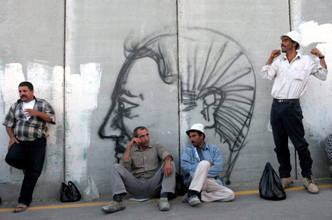 Palestinian workers stand in line next to Israels separation wall as they wait to cross a checkpoint into Jerusalem from the West Bank Town of Bethlehem, 26 June 2006. (Moti Milrod/MaanImages)