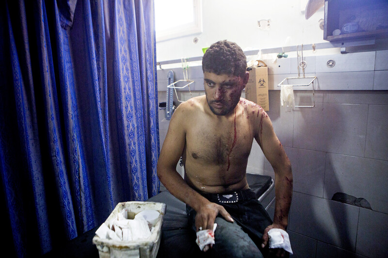 Dr. Nasser al-Tatar, the director general of al-Shifa hospital, had been working twenty hours a day since the offensive started on 7 July when I photographed him on 14 July. The previous week, when he took an hour off to go home and break the Ramadan fast with his family, a neighbor came running with a warning that the doctor’s home could be bombed at any moment. “I prayed, ran out with my family to the street and watched my house be destroyed, then I came back to work,” he said, standing on the ruins of what used to be his home and private clinic.