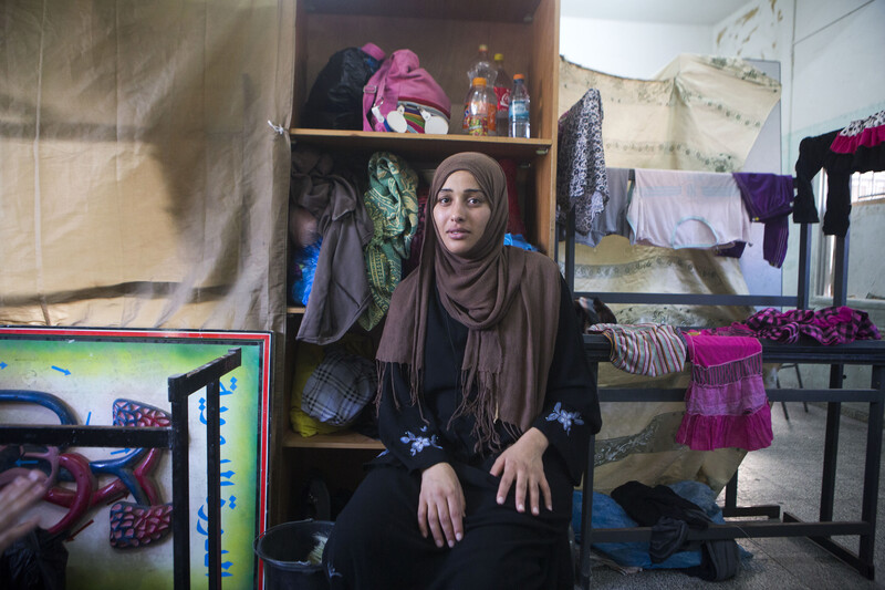 Nasreen in the room in which she was staying with her unemployed husband and six children in the Fallujah government-run school in Jabaliya refugee camp on 29 July after fleeing bombing in the northern town of Beit Hanoun. “Bombs still explode around us. A house next to ours was bombed and we don’t know if our house is still standing,” she said. Desperate for shelter, hundreds of Palestinians broke into the Fallujah government-run school in Jabaliya refugee camp. Approximately 3,000 took shelter in the school, which lacked basic facilities and provided neither food nor water.