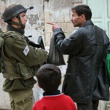 A Palestinian woman is forced to wait with her two sons at an Israeli army checkpoint in al-Tuwani. (Christian Peacemaker Teams)