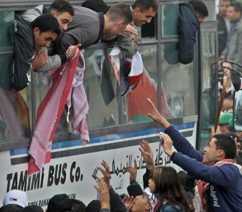Thousands gathered at the presidential compound in Ramallah on 3 December 2007 to welcome 429 Palestinian prisoners just released from Israeli jails as part of what Israel has called a “goodwill” gesture. Nonetheless, behind the cheering and flag waving, the feeling was bittersweet as the families of the released were overjoyed to have their loved ones returned, while there remained an atmosphere of cynicism towards Israel’s “gesture.”