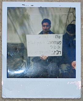 Fayeq (29), who works with his father at their household goods store in downtown Ramallah, was held for eight days at Beit Eel, the Israeli military base in Ramallah. Ra’fat (26), who has a master’s degree in accounting from Birzeit University, was held for 12 days. During that time, their family had no word from them. Because the military police lost Ra’fat’s ID, they gave him an instamatic photograph of himself holding a sheet that identified him.
