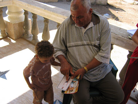 Sleiman showing pictures of Omar and Ziad to one of his grandchildren (Photo: Rima Merriman)