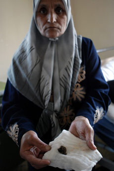 A mother of a young wounded girl from Nahr al-Bared holds a fragment of a shell that was in the injured girl’s stomach and had to be extracted in the Saffad Hospital in Baddawi Refugee Camp. (Tanya Traboulsi)