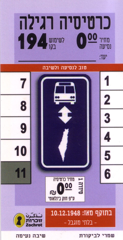 This bus ticket is presented by Zochrot [Remembering] as part of efforts to raise Israeli public awareness about the Nakba, the Palestinian catastrophe of 1948. Zochrot hosts several tours of destroyed Palestinian villages every year.