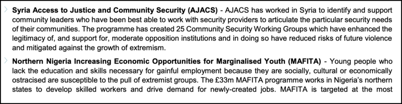 British government funding to one ASI project in Syria was halted soon after a 2017 BBC TV program exposed evidence that the contractors were funding and aiding al-Qaida.