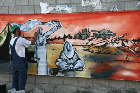 In Al-Bureij Younis refugee camp in Gaza a Palestinian artist paints a mural to commemorate the 40th anniversary of the naksa or setback of 1967 when Israel began its occupation of the West Bank, including East Jerusalem, the Gaza Strip, Golan Heights and Sinai Peninsula, 5 June 2007. (Hatem Omar/MaanImages)