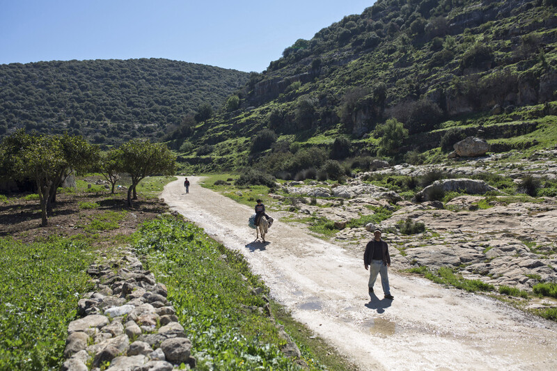 A Palestinian farmer walks ahead of a child along Wadi Qana’s main dirt road.
