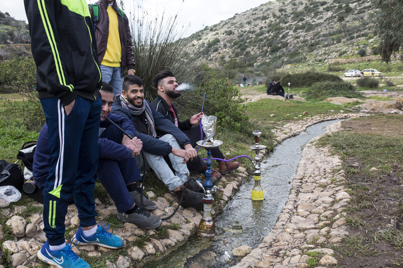 Palestinian young men smoke shisha at al-Bassa stream in the heart of Wadi Qana.