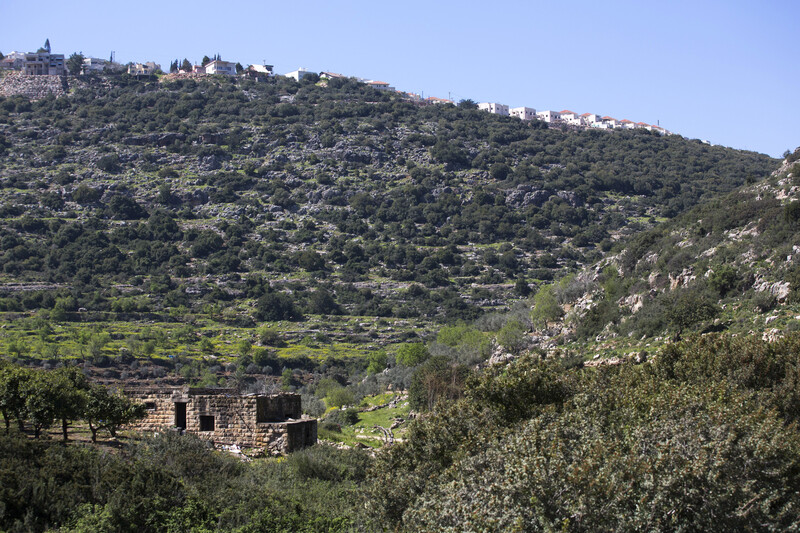 A Palestinian farm house can be seen at the bottom of the valley, and the Israeli settlement of Nofim can be seen at the top.