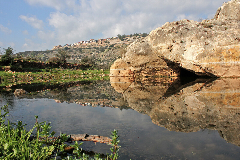 Al-Tanour spring in Wadi Qana is overlooked by an Israeli settlement rising in the background.