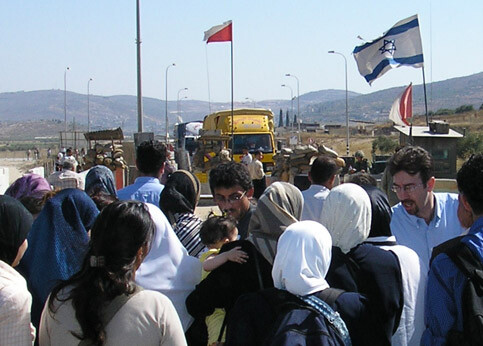 Palestinian women and men waiting at Huwara checkpoint near Nablus (Arjan El Fassed, 2004)